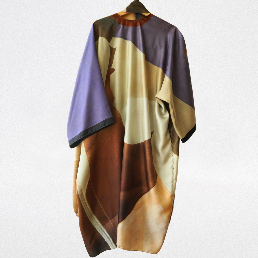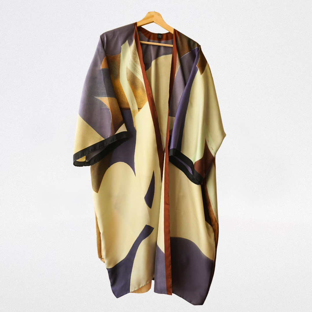 Kimono largo de seda con un estampado de manchas en tonos marrones, beig y morado acompañado por un cinturón a juego. La fluidez de sus líneas lo convierte en una elección perfecta para una amplia variedad de conjuntos y ocasiones. Ya sea llevándolo de manera informal con unos vaqueros o pantalones cortos en verano, o añadiendo un toque elegante en eventos más formales o como invitada, este kimono se adapta con facilidad a tu estilo. Su versatilidad lo transforma en una prenda esencial que no puede faltar en tu guardarropa.