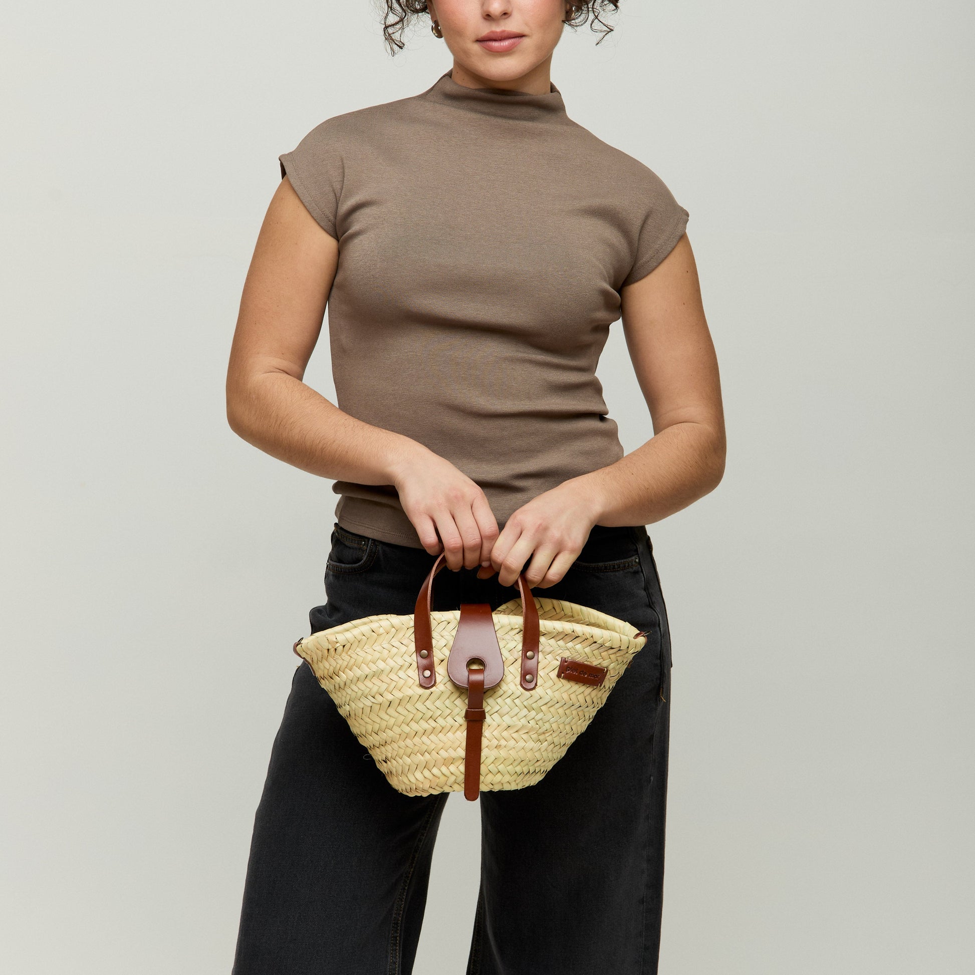 Handwoven in natural fiber and combined with hazelnut-toned leather, it preserves the essence of traditional basket bags in a compact and versatile format. Its lightweight design makes it ideal for carrying the essentials comfortably and in style.