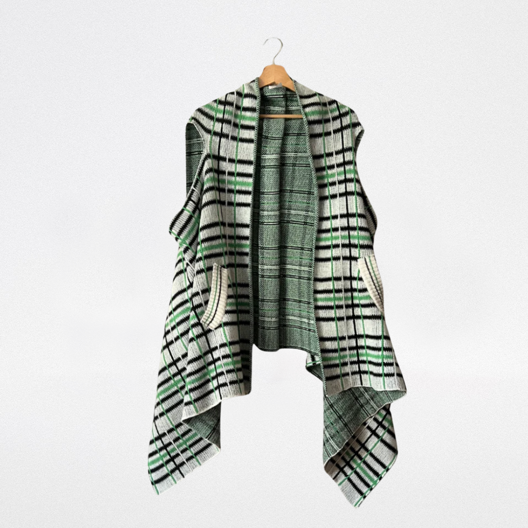 Chaleco-capa de lana a cuadros. Bolsillos laterales. Esta prenda ha sido elaborada en su totalidad en Italia, con diseño exclusivo de Lorena Benatti.