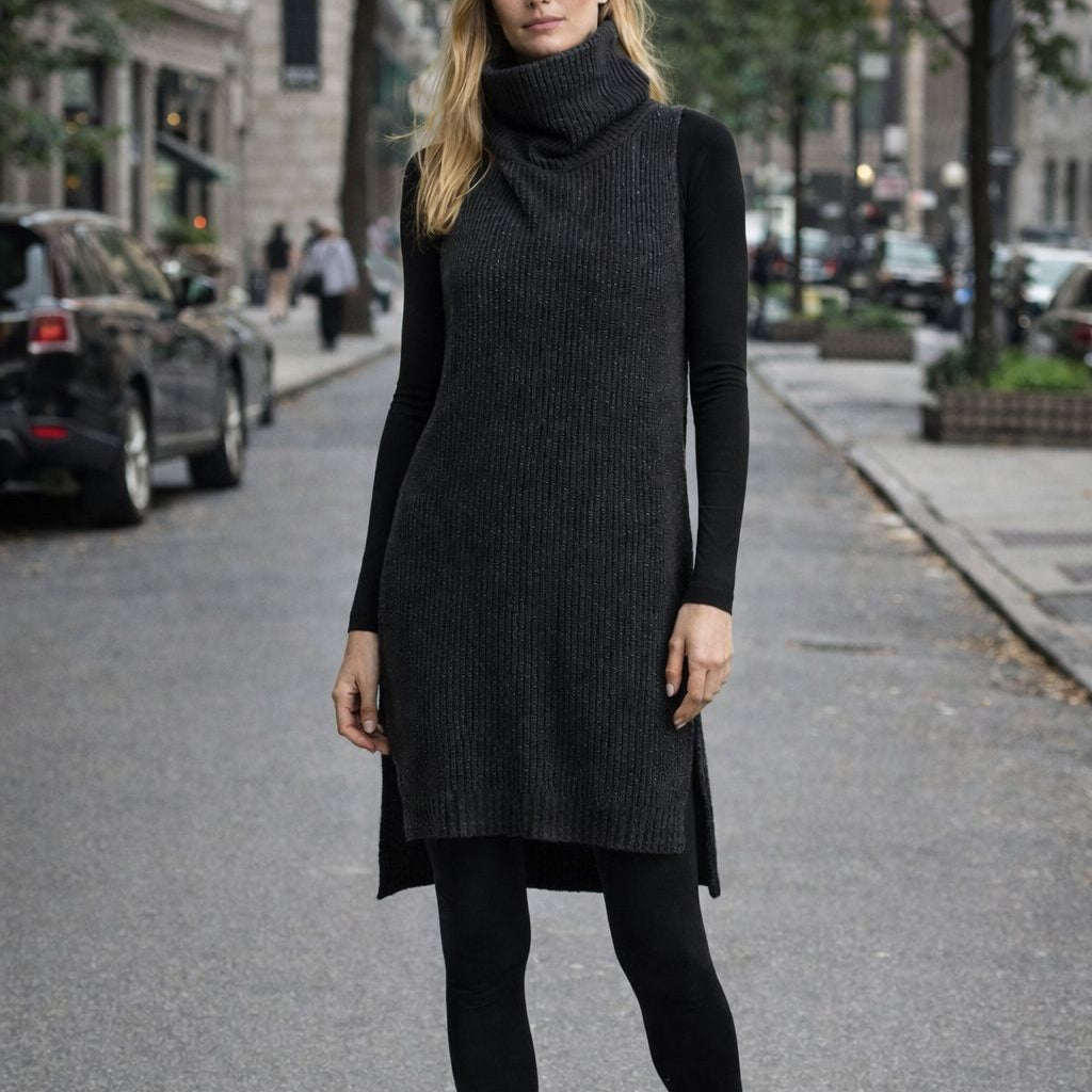 Túnica gris con gran cuello chimenea. Más larga por delante. Esta prenda ha sido elaborada en su totalidad en Italia, con diseño exclusivo de Lorena Benatti.