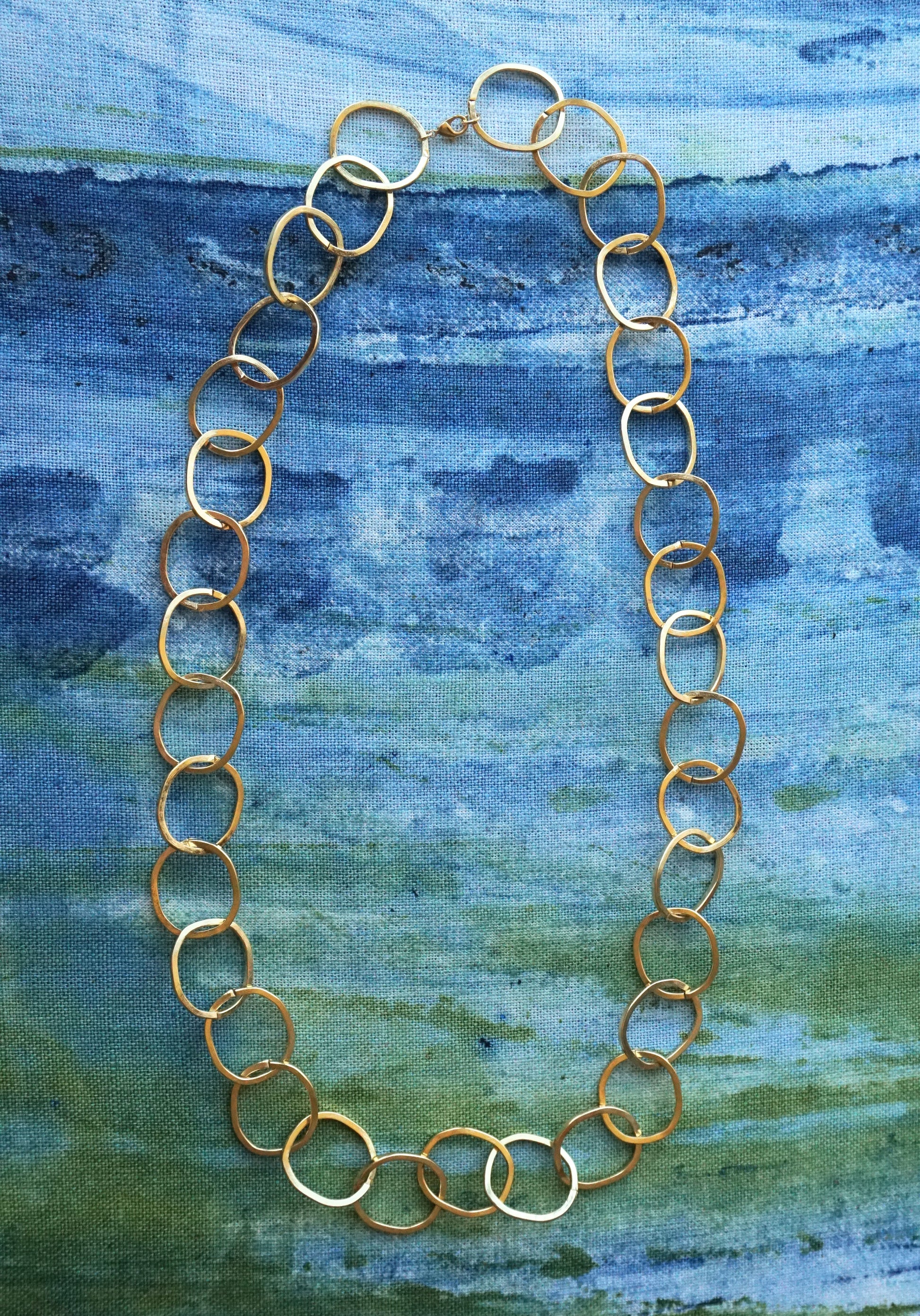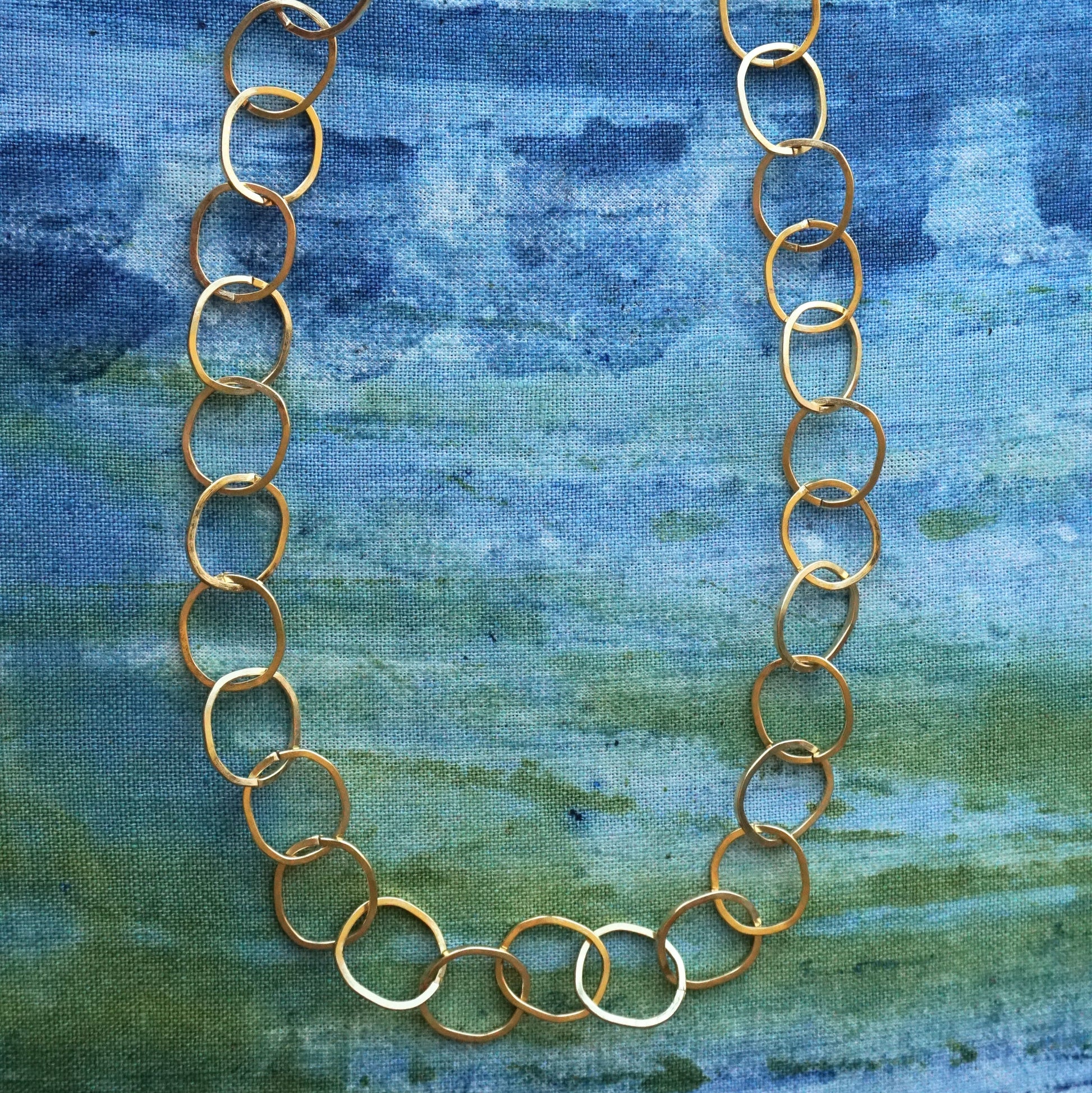 Collana lunga a catena con cerchi dorati intrecciati. La catena è realizzata a mano in zamak placcato oro.