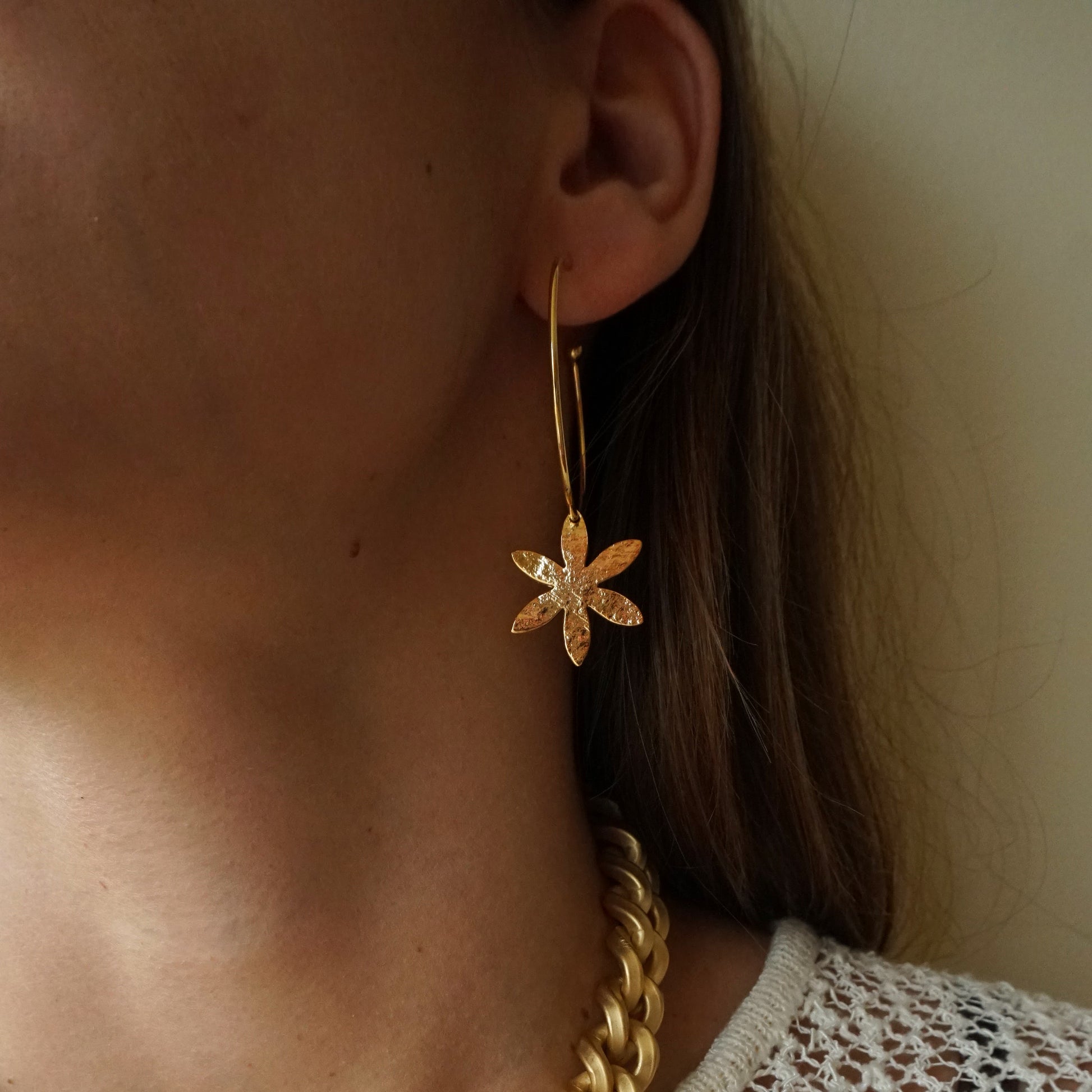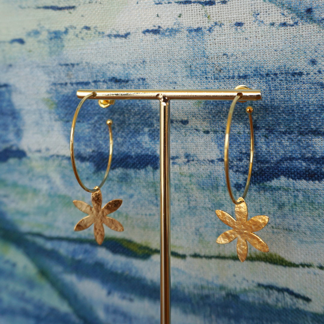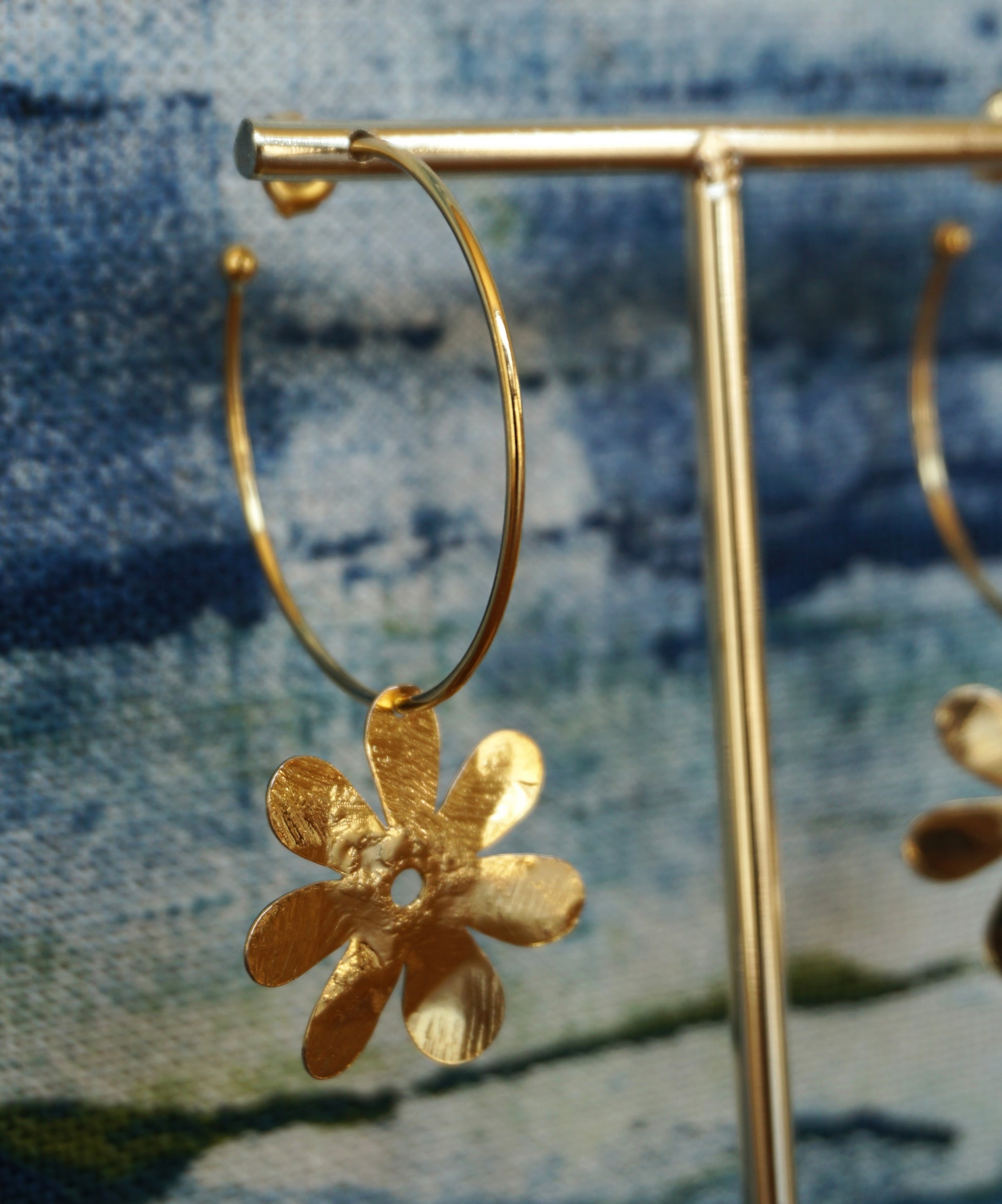 Orecchini cerchi sottili e fiori in zamak. Hanno la chiusura a pressione.