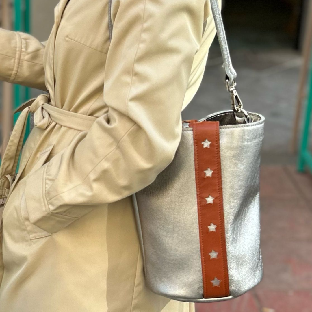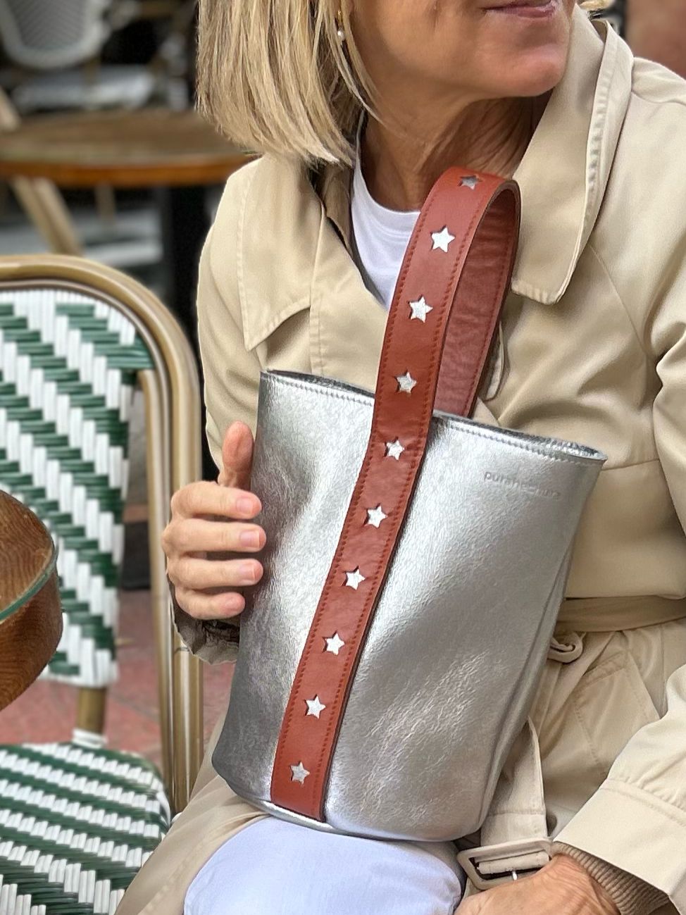 Su asa de mano, troquelada con estrellas en contraste, aporta un toque distintivo y artesanal a su diseño.