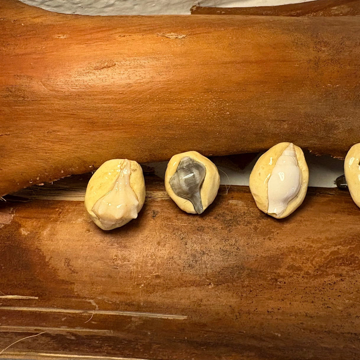 Anillos con diferentes conchas marinas incrustadas en arcilla y con acabado de barniz.