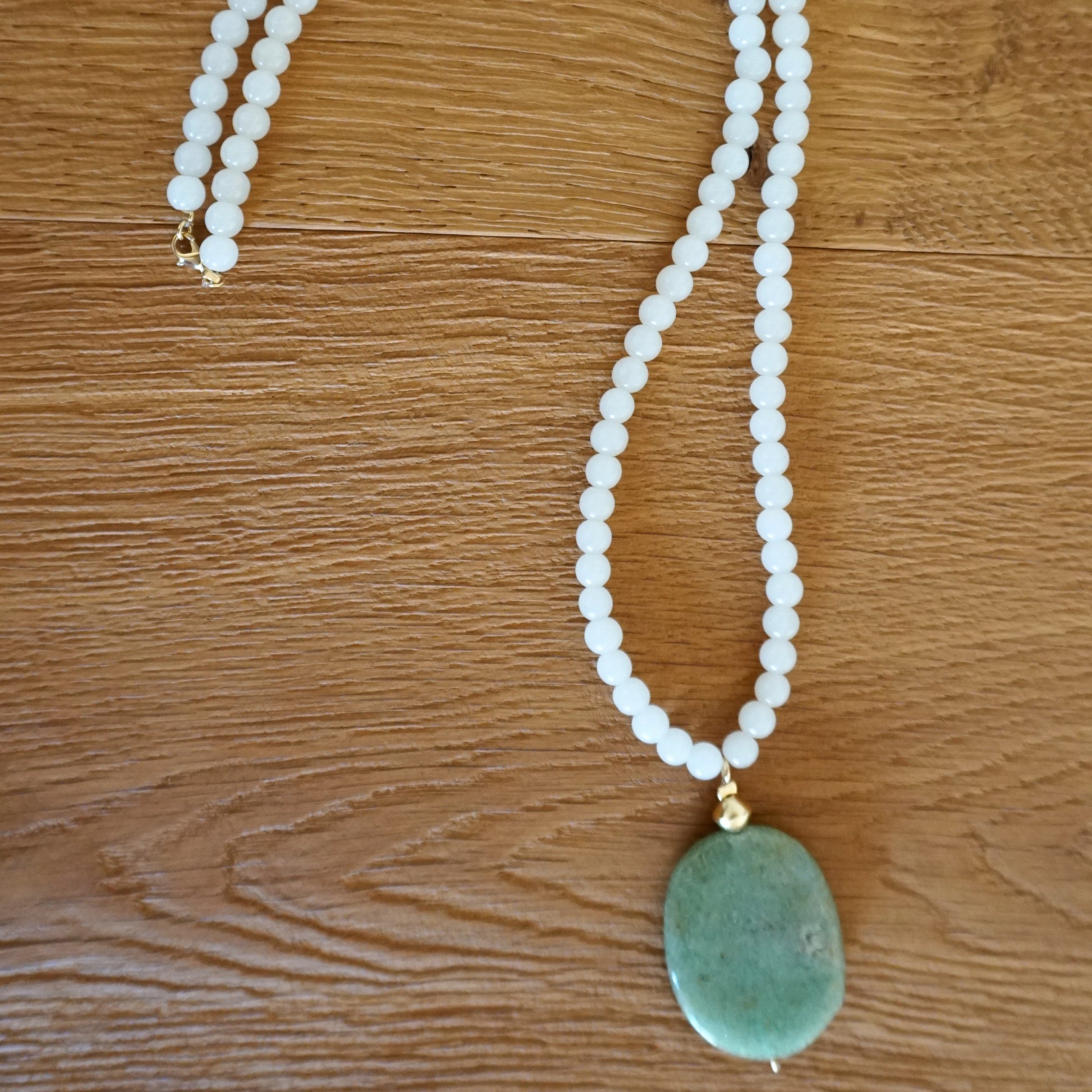 Collar de cuentas de cristal blancas y piedra ovalada verde.