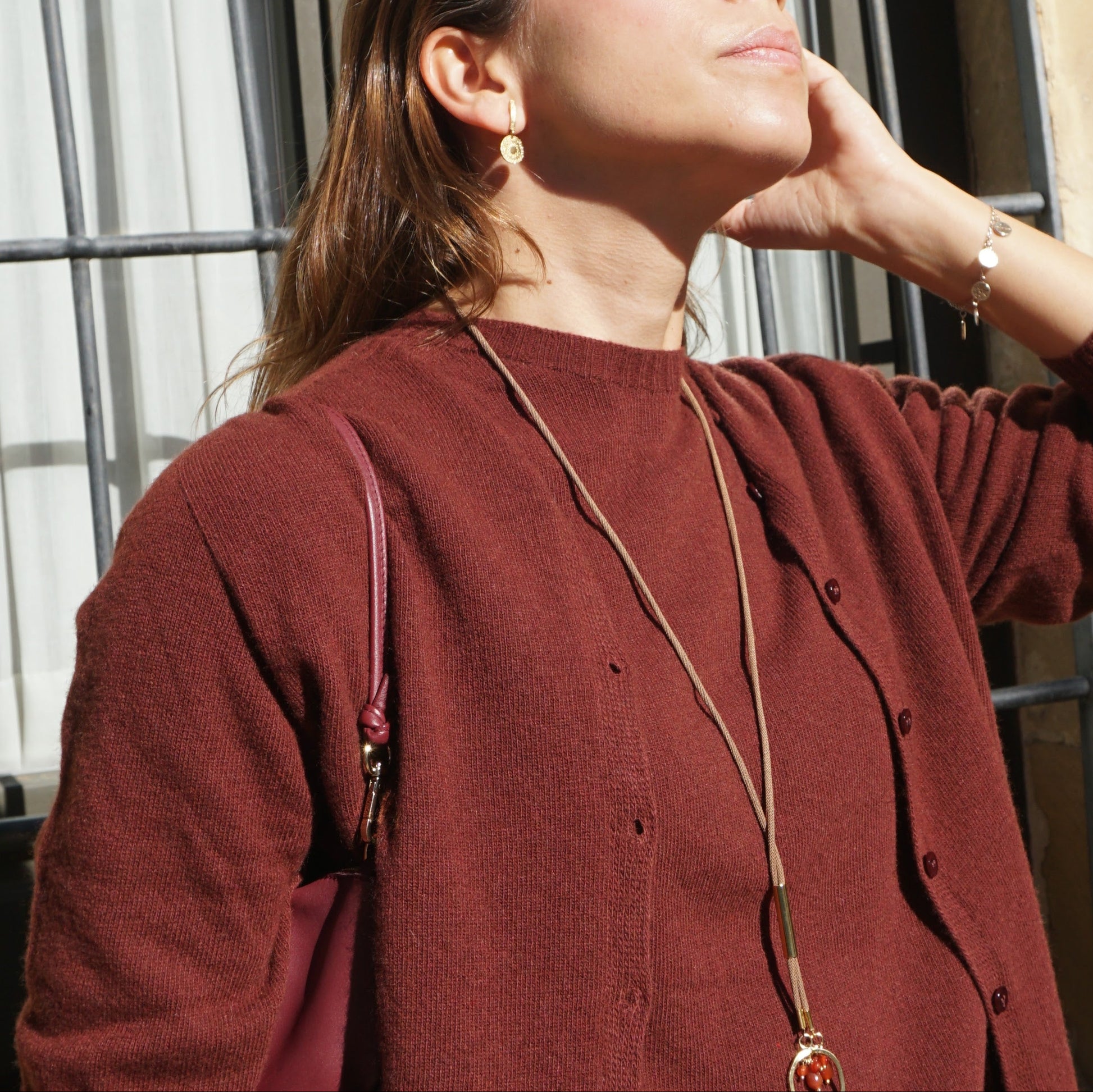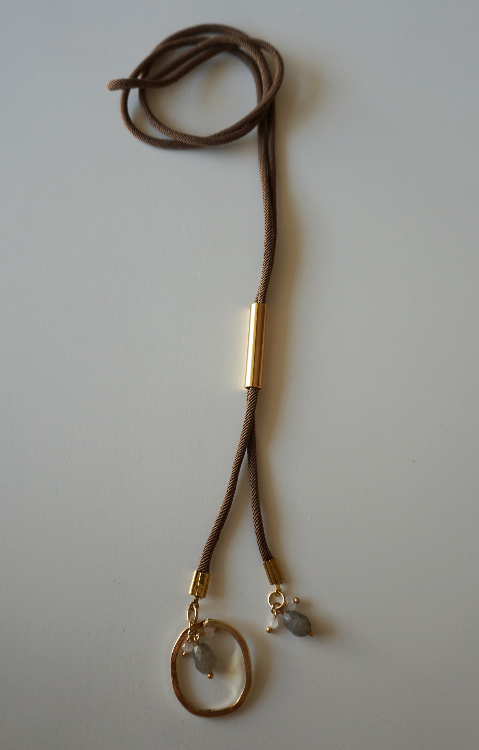 Collar con cordón, colgante de círculo con bolitas de cristal facetado en los extremos del cordón. El cordón permite llevarlo también más ajustado al cuello tal y como se aprecia en las fotos. El colgante está hecho a mano en zamac bañado en oro.