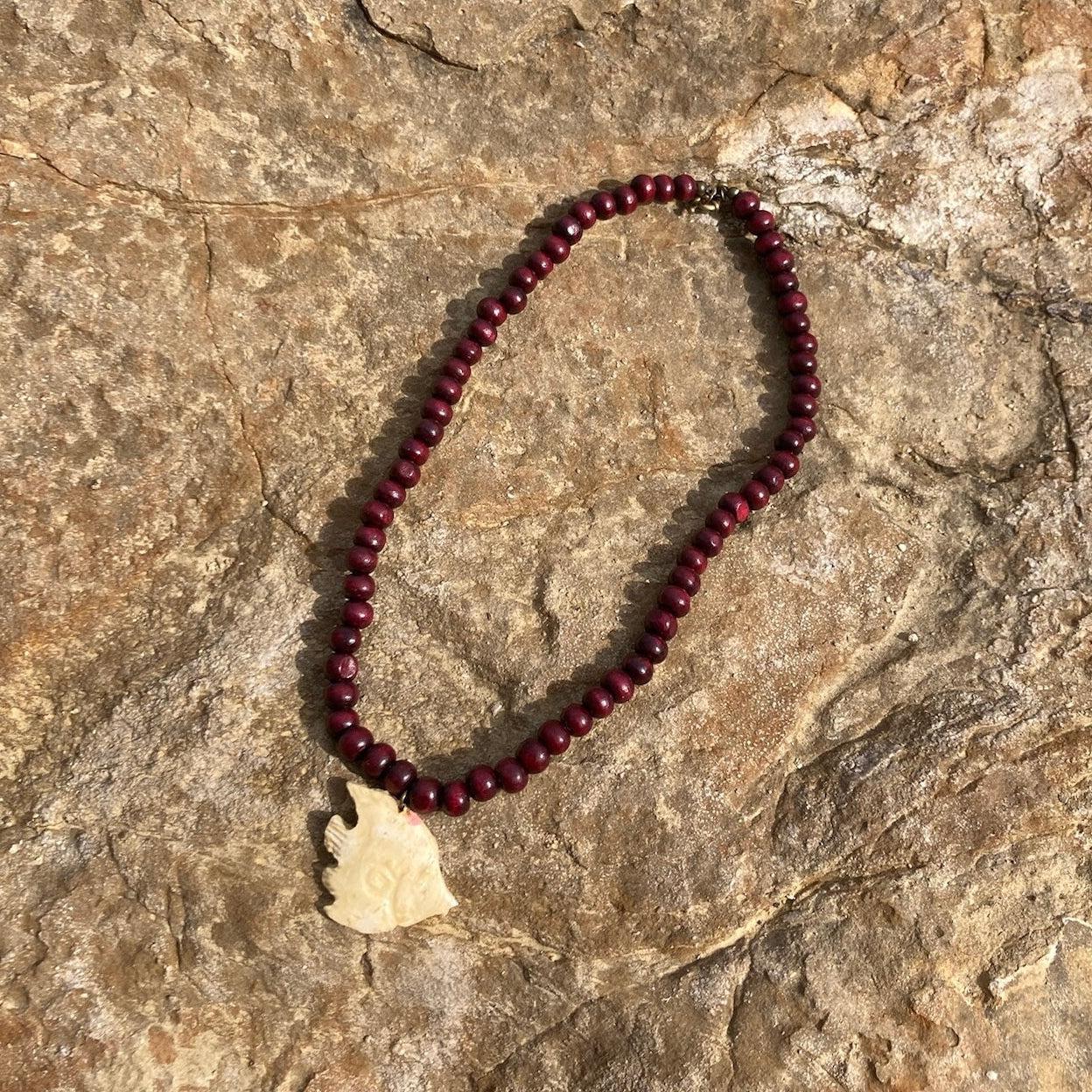 Collar de cuentas de madera oscura con colgante de pez en arcilla.