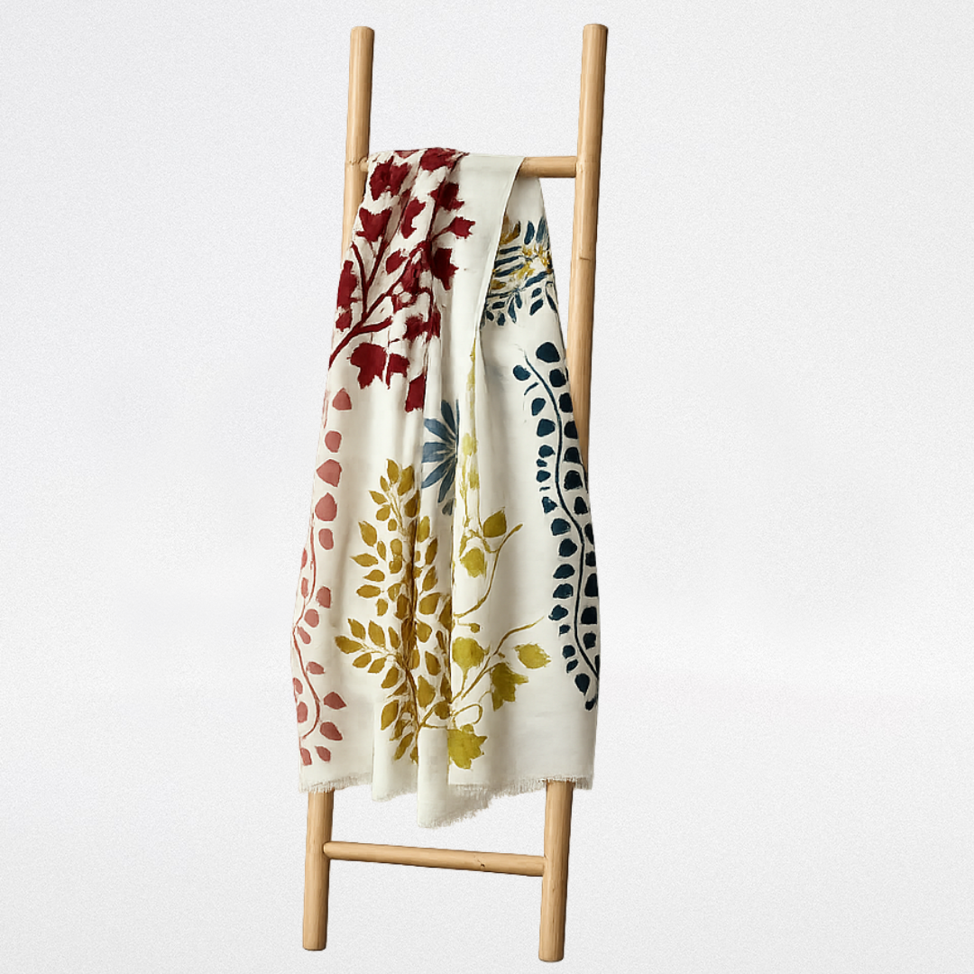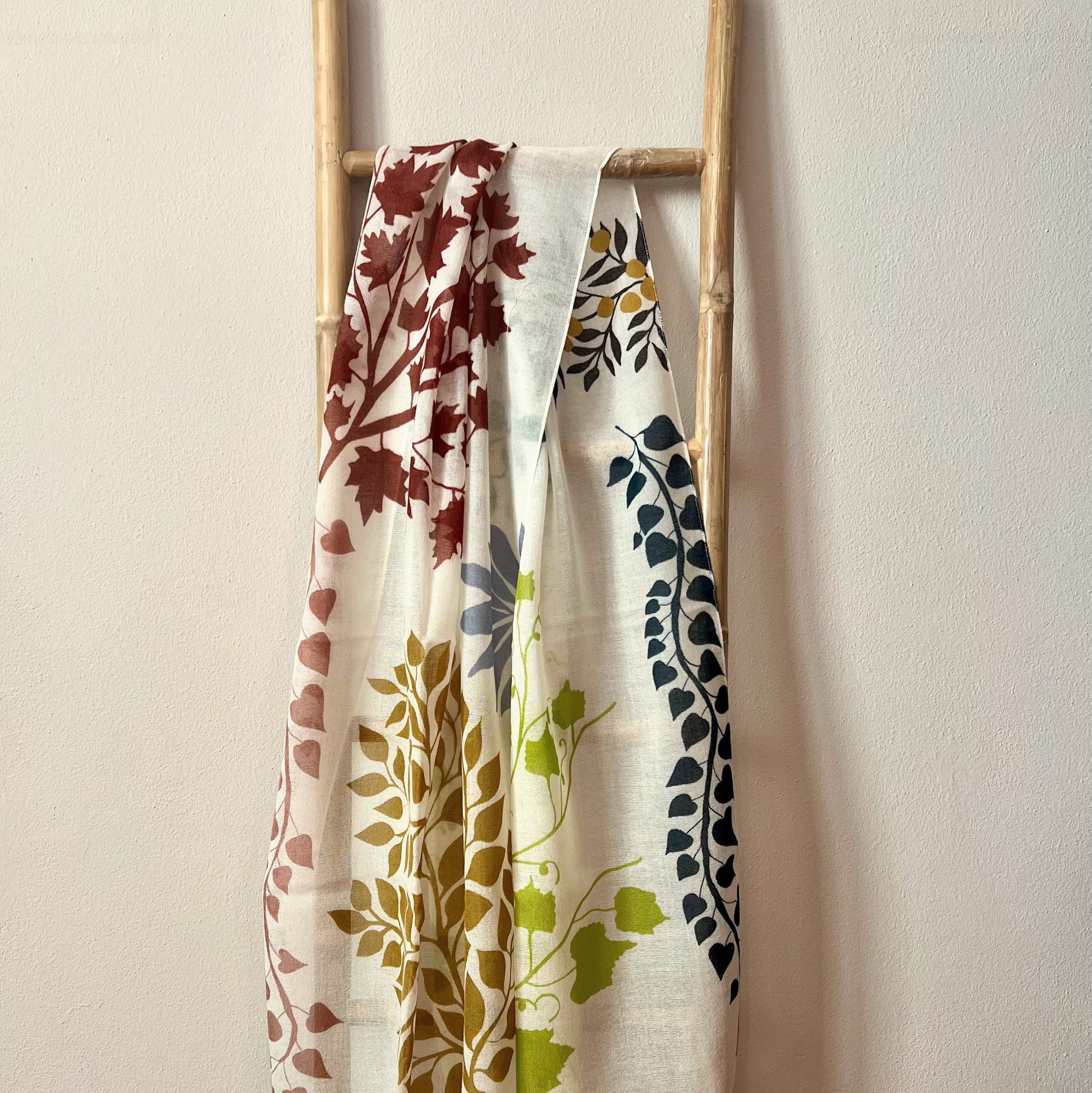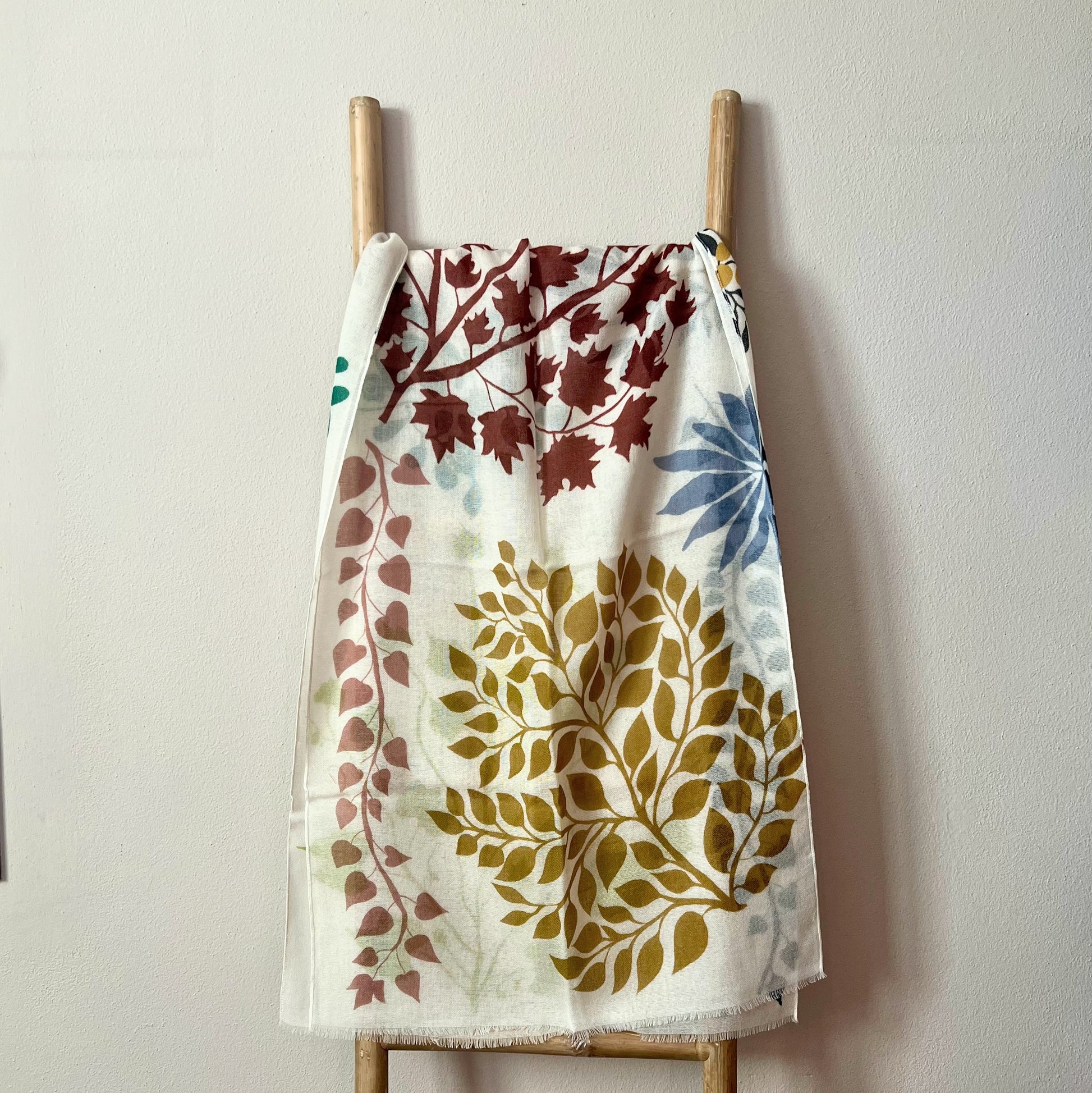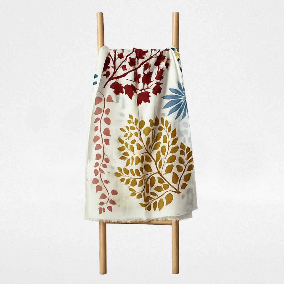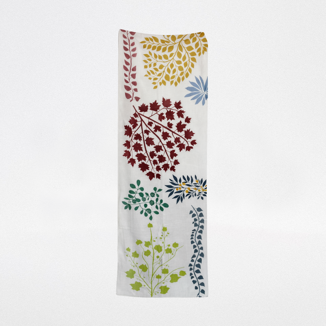 Fular de lana color marfil con dibujo de ramas en varios colores.