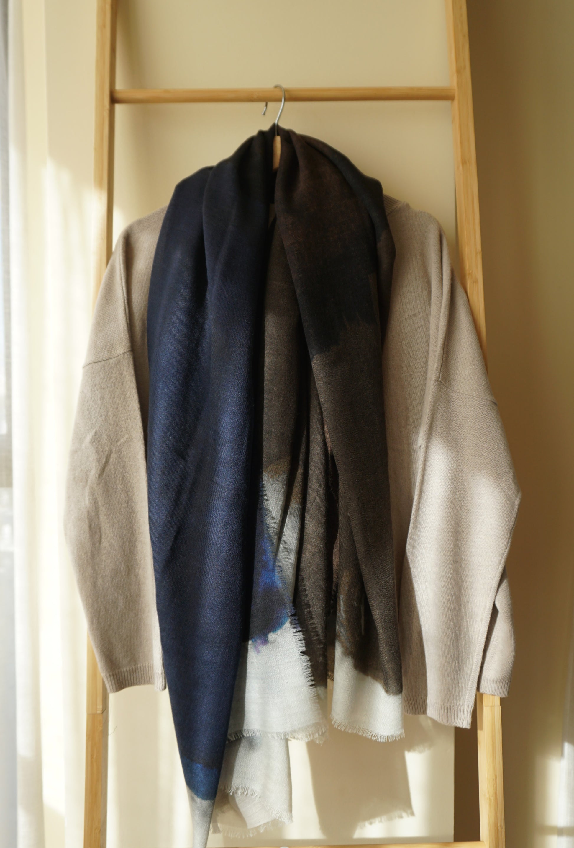 Maxi pañuelo de lana extra fina eni tonos azul marino, marrón y marfil.