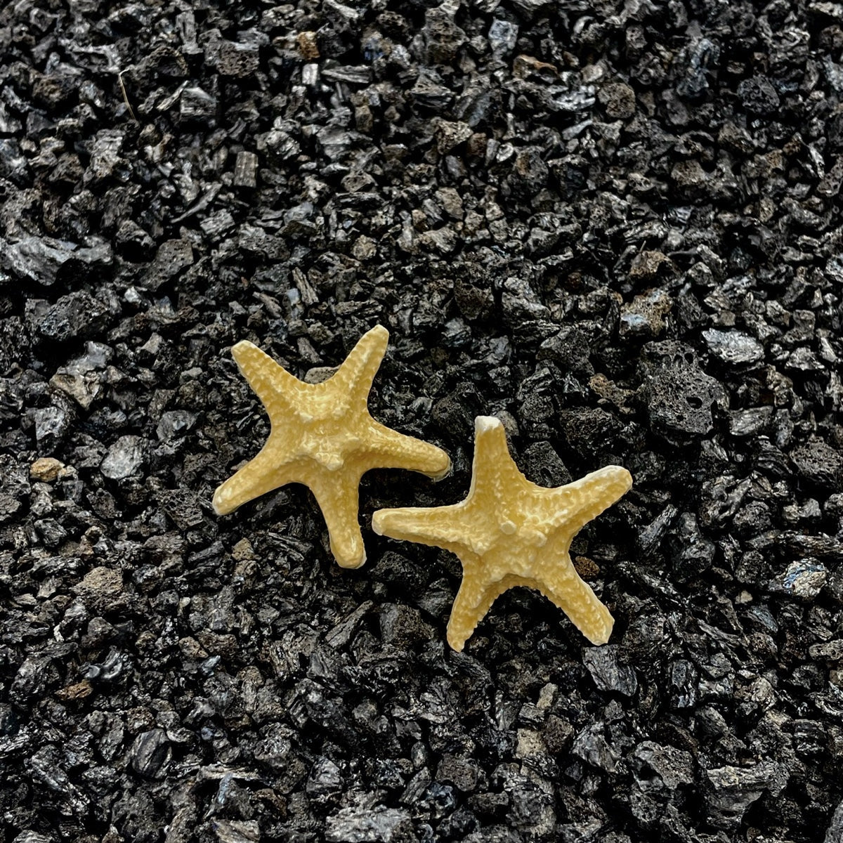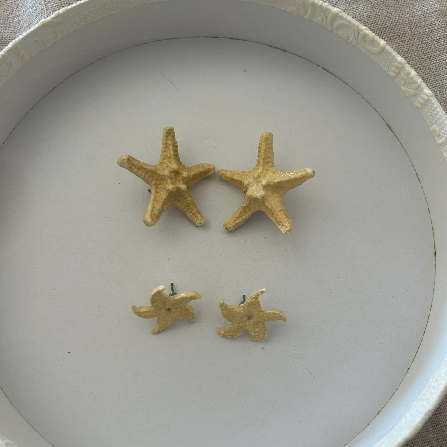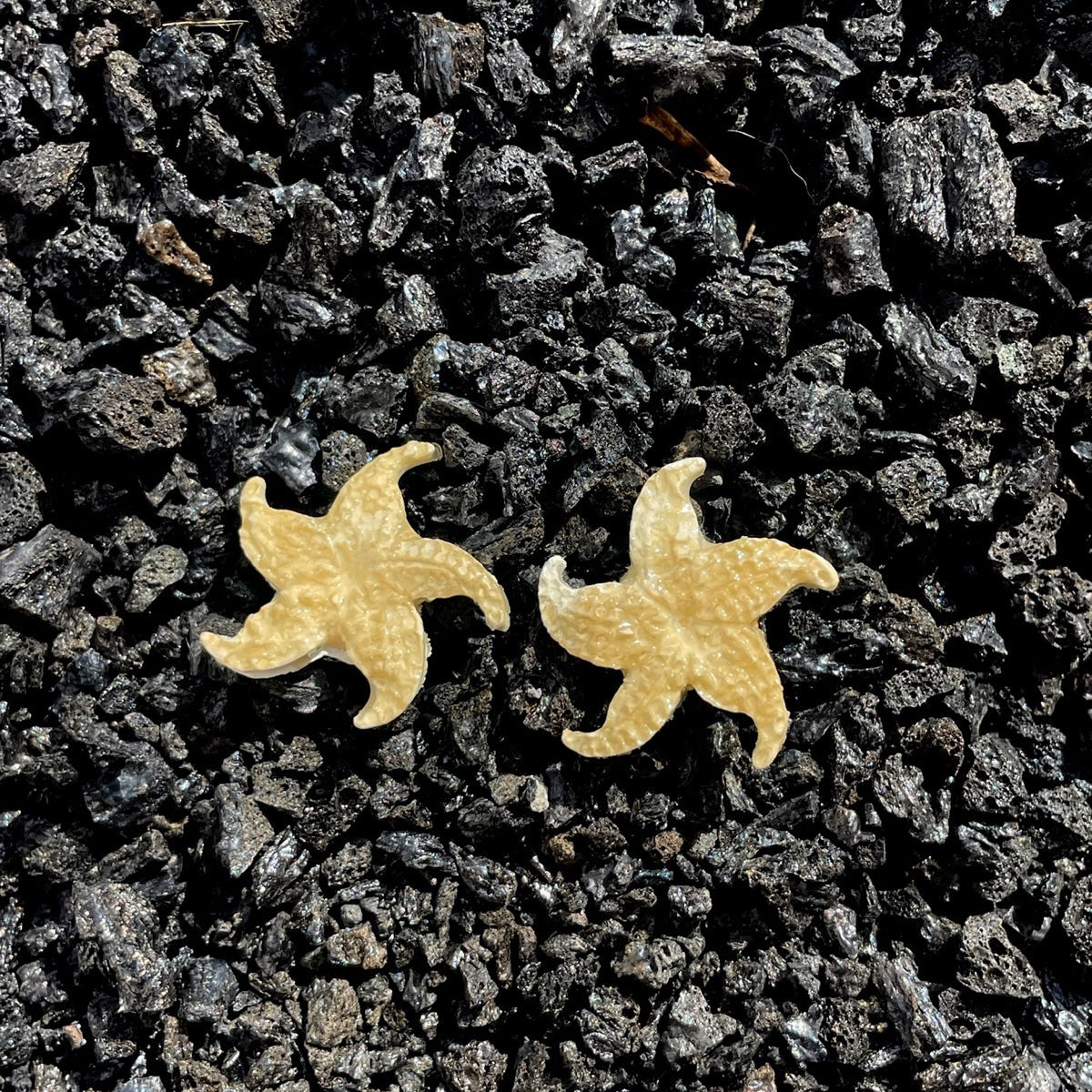 Pendientes con estrella de mar en arcilla. La parte en contacto con el orificio es de acero inoxidable.