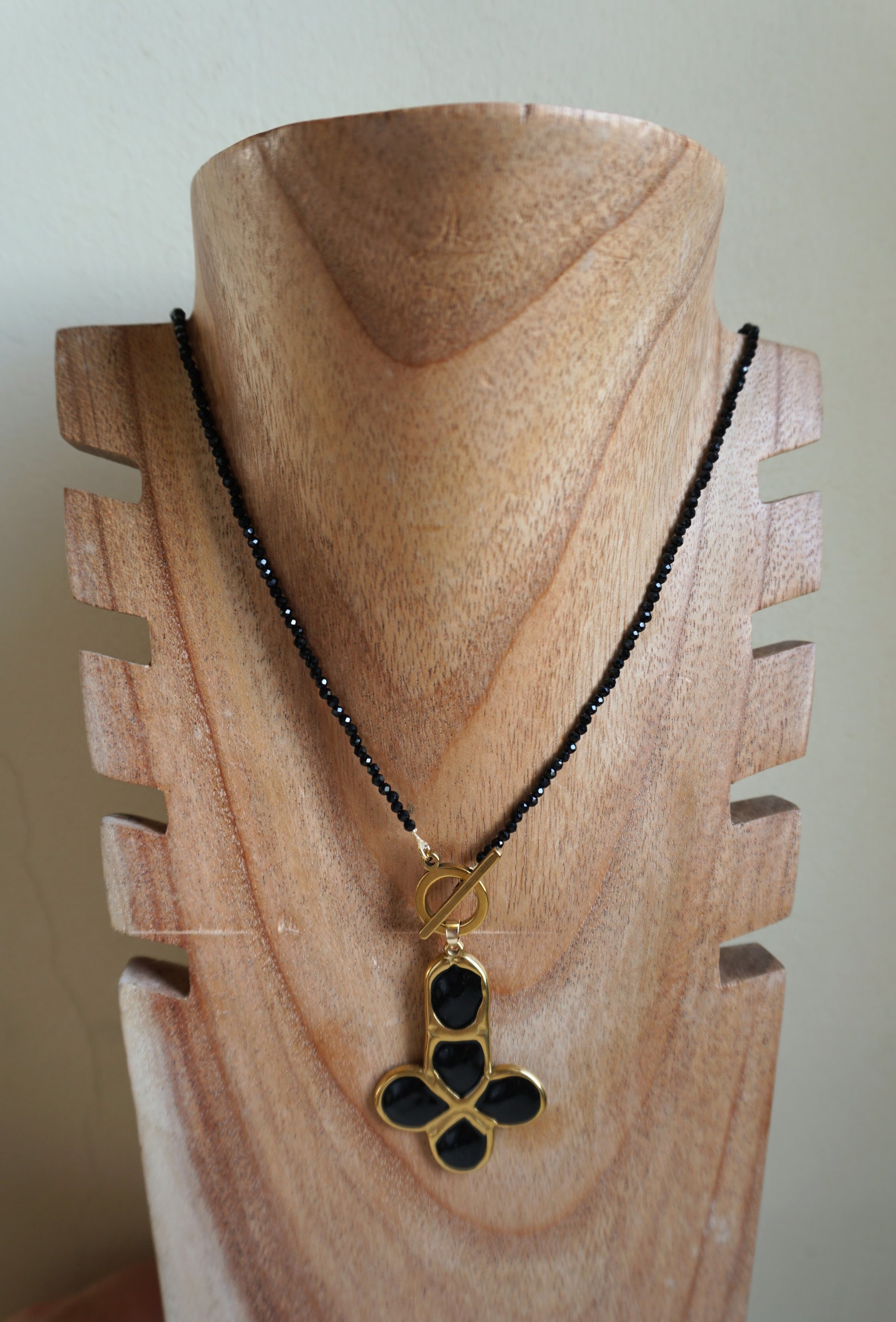 Tira larga de piedras y colgante de cruz dorada con piedras negras, con cierre de barra dorada.