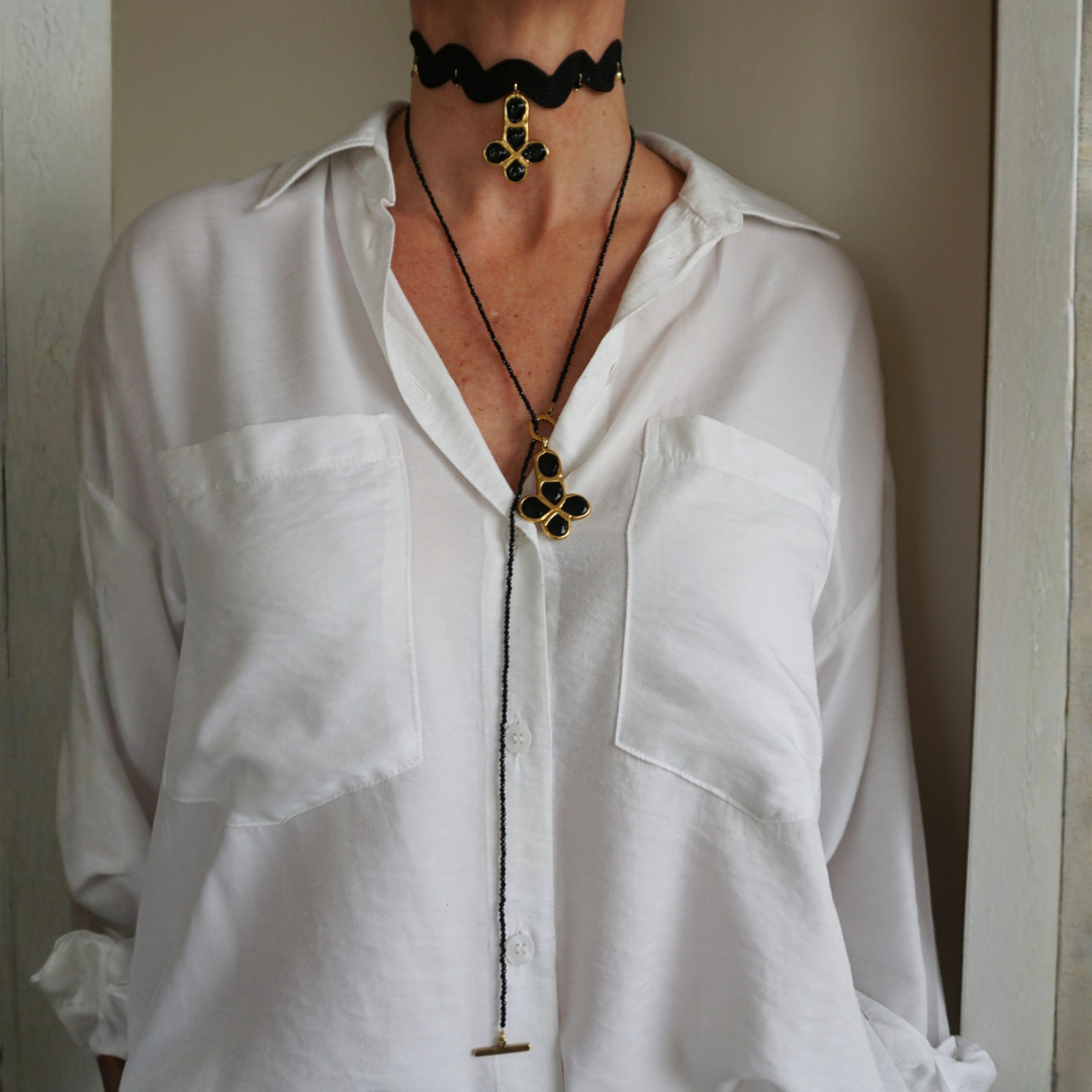 Precioso para llevar solo o junto con el Choker Ondulina con cruz dorada de piedras negras.